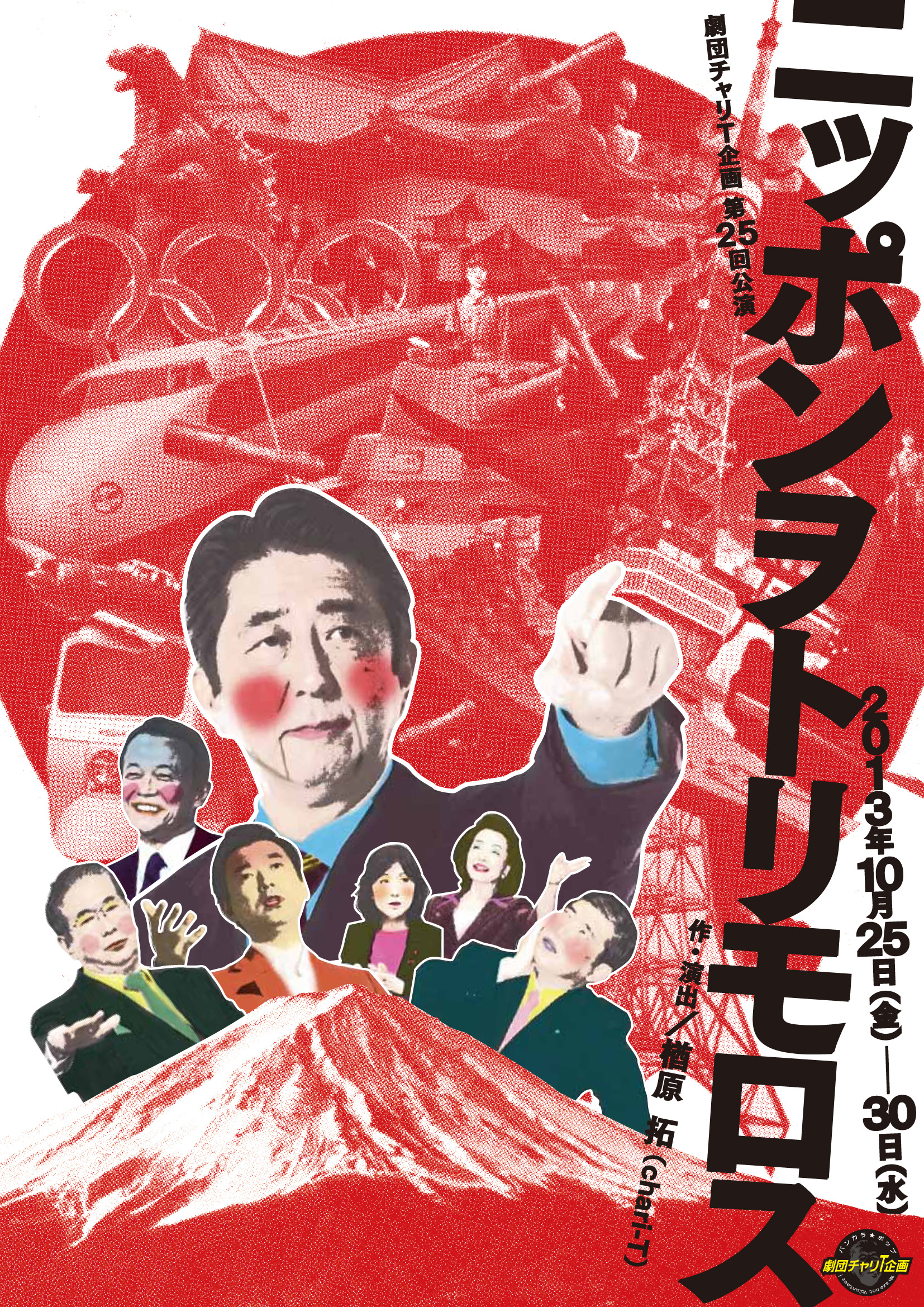 出 演/小杉美香、下中裕子、室田渓人、丸山夏未 他 劇団チャリT企画 、1年4ヶ月ぶりの新作本公演! 「ニッポンをトリモロス(取り戻す)!」と意気揚々の我が国のリーダー。 彼らの「トリモロ」そうとしている「ニッポン」とは一体何なのか!? 「ニッポン」は「トリモロ」せるのか!? なぜ「取り戻す」は「トリモロス」と聞こえるのか? ふざけた社会派・チャリT企画が不真面目ながらも徹底検証! 彼らが夢想する三丁目だか四丁目だかの夕日の果てにある景色をチャリT流に笑い飛ばす ウルトラB級ドタバタ茶番狂騒劇! おいでおいで楽しいよ(^^) ▼スタッフ 照明/伊藤 孝(ART CORE) 音響/島貫 聡 舞台美術/稲田美智子 衣装/久保田早織 舞台監督/森崎美弥子 スチール/鈴木 淳 宣伝美術/BLOCKBUSTER・NO DESIGN 当日運営/横井佑輔(犬と串) 制作/チャリT企画 カンパニースタッフ/teamC.T.K 協力/ウィーズカンパニー、MC企画、椿組 主催:チャリT企画 ========================================================================================= 【一行でないレビュー(ご意見・ご感想)】 ◇10/26(土)15:00 ●このセンス…好きです。(男性・48歳) ●なかなかブラックな感じがよかったですが、国名はもう少しボカした方が良かったかと思います(国としては私も嫌いですが…) 次回作も期待しています。(男性・会社員) ●ブラックかつコメディ、社会風刺もピリッとしてとても楽しかったです。テンポもよく見やすかったです。(年齢・性別不明) ●本当オリンピックどうなるんでしょう。ボランティア3000人あつめるらしいですよ。38度のマラソン人死にますよね。都民、税金出したくないって言ってますよ。(女性・社会人) ●大人しか観てはいけないドリフ、でよろしいでしょうか。あらけずり感が良いです。(男性・43歳・会社員) ●いくつかのアイテムを並べただけで力尽きたか。残念。(男性) ●ジブリ作品を知らないので、周りの笑いがよくわからないところがあった、宅急便のところ。(年齢・性別不明) ●次節ネタわらいました。ボウがない…結局なんだったかよく考えてみます。(男性) ●上映時間一時間というのは非常にテンポが良くて、観ていて中だるみを感じませんでした。(男性・29歳・大学生) ●日本をThe ENDにしてはならない。オリンピックよりほかにやらなければならないことが沢山ある日本、原発は必要悪なのか考えてみます。(男性・65歳・会社員) ●はじめのところから笑ってしまうところが多くて、楽しい時間を過ごせました。(年齢・性別不明) ●ジブリ大好きか!!私も大好きだが!!風立ちぬネタをさっそくぶちこんできたWW 水の演出がすごいと思います。最初は光の演出だと思いましたが、実際に降らせているのでビックリ。キキ、いや危機がビショぬれww風邪ひかないで!! 支配人と従業員のかみあわないトークがシュールすぎて楽しかった!(年齢・性別不明) ●あまり意味がわかりませんでした。(年齢・性別不明) ●少しシュールでまだちょっと消化できていないので、感想などの形にまとめられないのですが… やぶ水道屋さんのキャラが立っててそれはわかりやすかったです。あの過激な3人組が誰の風刺にあたるのか(首相???)(年齢・性別不明) ◇10/27(日)15:00 ●今回初めて拝見しましたが、ちょっと内容とタイトルがアンバランスな気がしました。そのためどう評価して良いかわからないです。とりあえず次回公演を見て判断したいと思います。(男性・45歳・会社員) ●これは、ひどい。(男性・33歳) ●とてもシンプルで面白かった。ドリフネタや70年ネタは特によかった。(男性・31歳) ●いつもよりテンポがゆっくりだった気がする。次の会話が出てくるまで、まちが長い気が…。最後のガチャガチャでチャリTらしさが出て良かった。(年齢・性別不明) ●結構まどろっこしい間合いがあり、少々イラっと感じたところあり、終わり方が級でわかりにくかったです。 お水、たいへんでしたね。おつかれさまです。(年齢・性別不明) ●今話題となっている事柄を取り上げているのが新鮮で驚きでした。見ていて何だかなつかしい印象をもちました。今後ともがんばって下さい。(女性・57歳・主婦) ●もう少し、暗喩的な、楢原さんらしい頭脳明晰さ振りを拝見したかった!(女性・58歳・主婦) ●ブラックコメディで面白かった。特に松本さんと内山さんのからみが自然な感じで実際に会社にいそうで良かった。(年齢・性別不明) ●最初から最後まで面白かったです。あと30分くらい長くやって頂きたかったです。支配人の電話の受け答え、特に面白かった。(年齢・性別不明) ●おもしろかった、また見にいきたい。(女性・10歳・小学生) ●王子小劇場がこんなに水びたしになってるの初めてみました(笑)一時間に色んなことモリモリで、アレ?一時間でおわっちゃうんだ…と感じました。 最後まで、カゼひかないように気をつけて下さい(笑)(女性・27歳・アルバイト) ●(1)想像を超えた不謹慎さ。SPECの結末より驚き(多分)。 (2)屋台崩し、ときたか。 (3)前半部はちょっと冗長、かつ、たいくつか